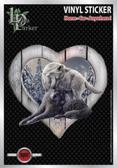 Beautiful looking wolves kisses auto window sticker Illustrated by renowned fantasy artist, Lisa Parker. Item is printed with vibrant colors on durable white vinyl, kiss-cut (peel off). Package size is 6 x 8 inch. Good for indoors/outdoors. Also available in large format wall sticker